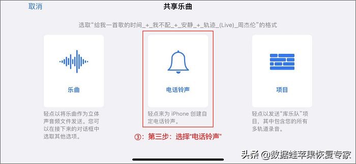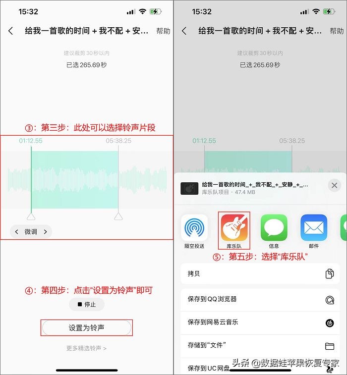 步骤2:选取好片段后点击【设置为铃声】,在弹出的新界面中选择【库乐队】即可;