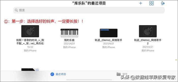 步骤3:进入到库乐队里面后则可以看到下载好的铃声,然后长按下载好的铃声后会弹出新界面;