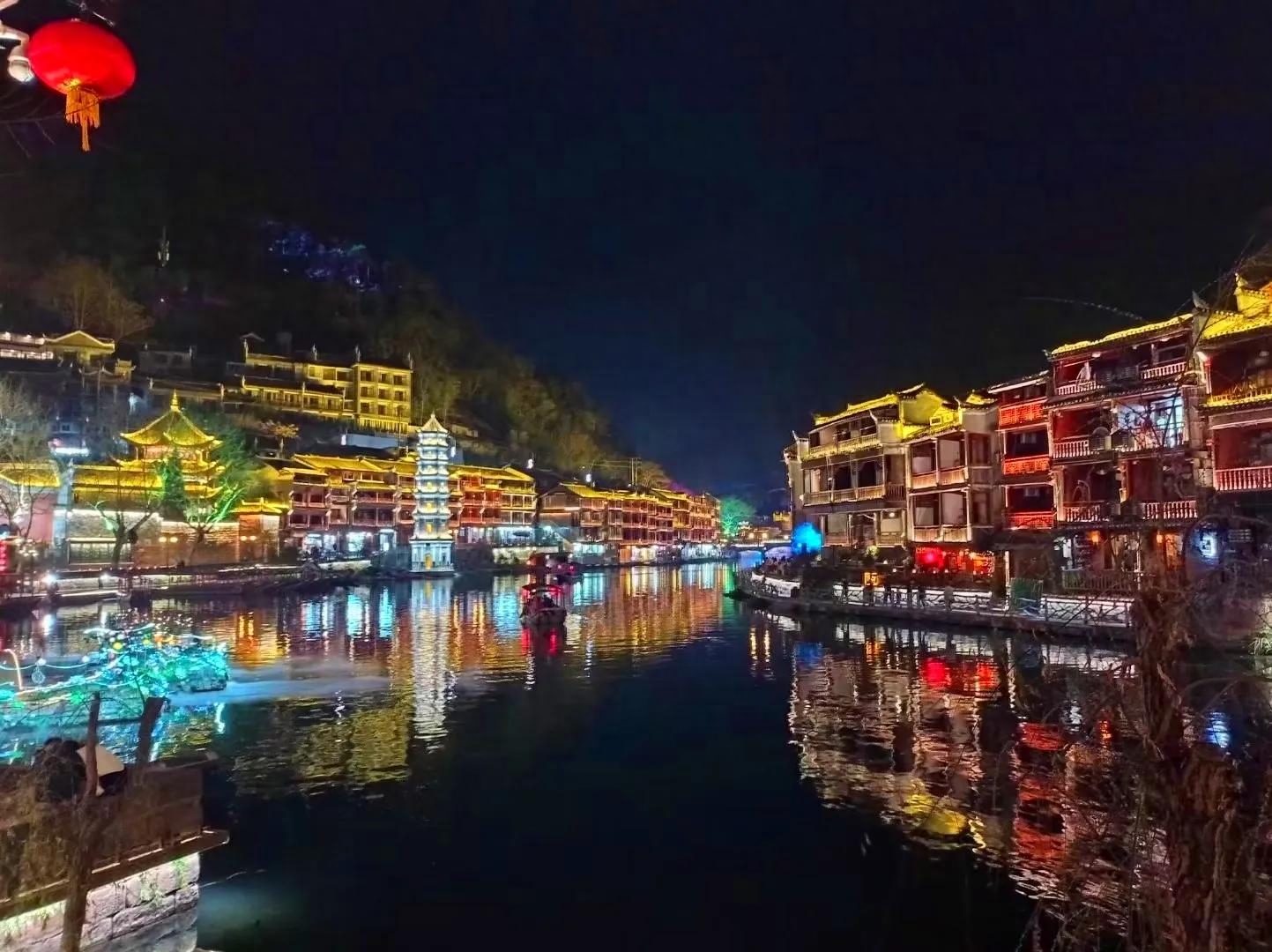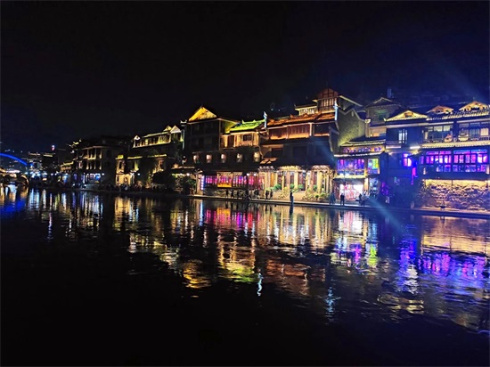 去过的云南丽江古城和贵州的镇远古城,夜景之美给我留下了深刻的印象,没想到凤凰古城的夜景也很美。夜晚的凤凰古城,灯火辉煌,流光溢彩,璀璨迷人,沱江边的吊脚楼倒影在江水中,如诗如画如梦如幻。也许有人会说,被现代灯光装饰出来的凤凰古城夜景很俗,像是被浓妆粉饰起来的女子,对我来说,现代灯光和古建筑结合在一起的美也是一种美。
