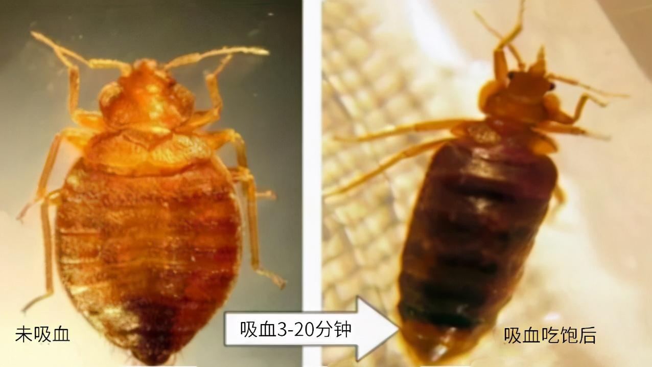 臭虫也被称为床虫,是一种很难消灭干净的昆虫。臭虫的若虫、雌/雄性成虫都是依靠吸血为生的,成虫每次吸血需要12分钟左右,若虫需要7分钟左右,它们的吸血量通常超过自身重量1-2倍。如果你看到臭虫肚子是圆滚滚的,则是吸饱血的臭虫。