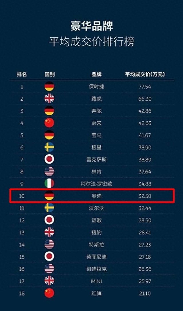 号称一线豪华品牌的奥迪,平均的成交单价只有32.50万,比路虎、雷克萨斯、林肯等二线豪华都还要低,较之沃尔沃,它也只是高出0.06万(六百块)而已。我们再看奔驰和宝马,成交均价都超过了40万元,几乎比奥迪高出10万元。