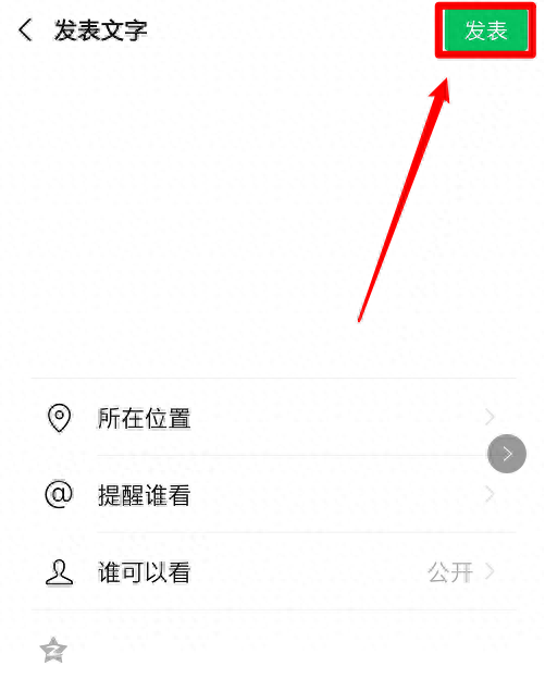最后再次长按朋友圈右上角的拍照按钮,进入文字编辑模式,这时候你看到不用输任何内容,右上角的【发表】按钮已经可以按了,直接点击【发表】即可。
