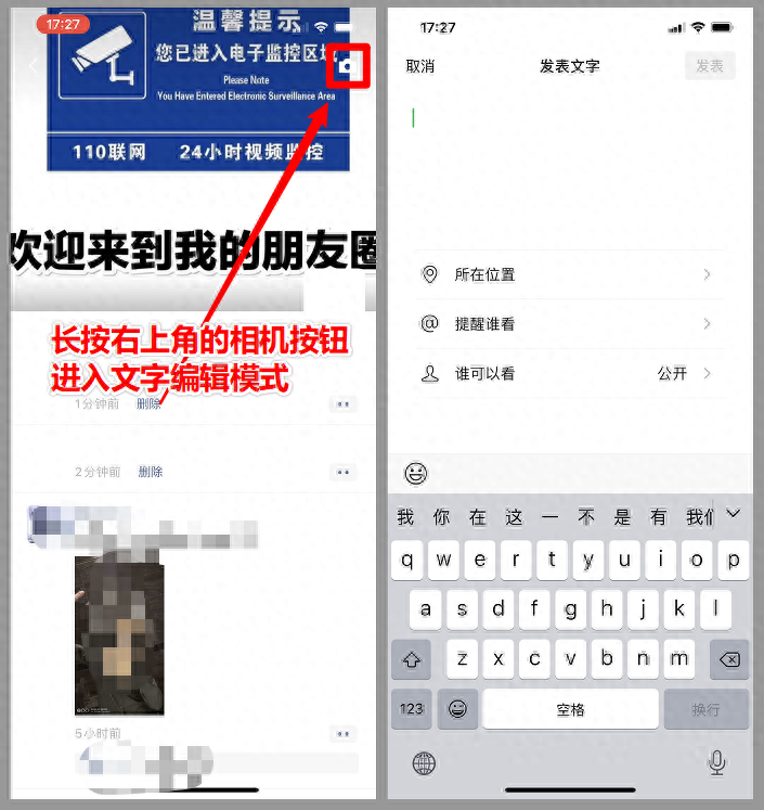 同样长按朋友圈右上角的拍照按钮,进入文字编辑模式,记住,是