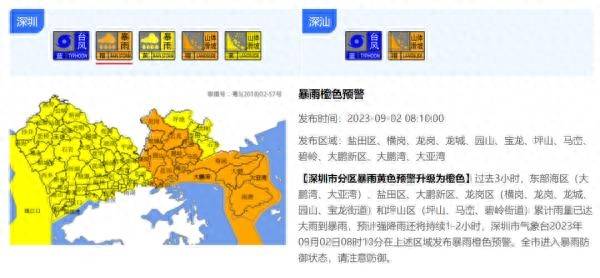 【深圳市分区暴雨黄色预警升级为橙色】过去3小时,东部海区(大鹏湾、大亚湾)、盐田区、大鹏新区、龙岗区(横岗、龙岗、龙城、园山、宝龙街道)和坪山区(坪山、马峦、碧岭街道)累计雨量已达大雨到暴雨,预计强降雨还将持续1-2小时,深圳市气象台2023年09月02日08时10分在上述区域发布暴雨橙色预警。全市进入暴雨防御状态,请注意防御。
