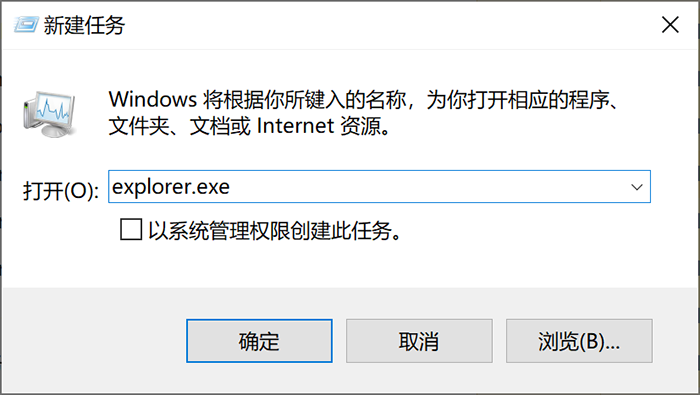 新建的任务窗口中,在输入框输入“explorer.exe”,接着点击确定。你会发现,原本消失的电脑桌面图标都出来了。
