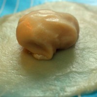 6. 将面团擀圆,放入油酥,包起,收紧收口。