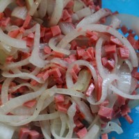 5. 洋葱切丝,放入锅中炒至断生。将火腿切丁,和洋葱丝、胡椒粉、盐拌匀,即为内馅。