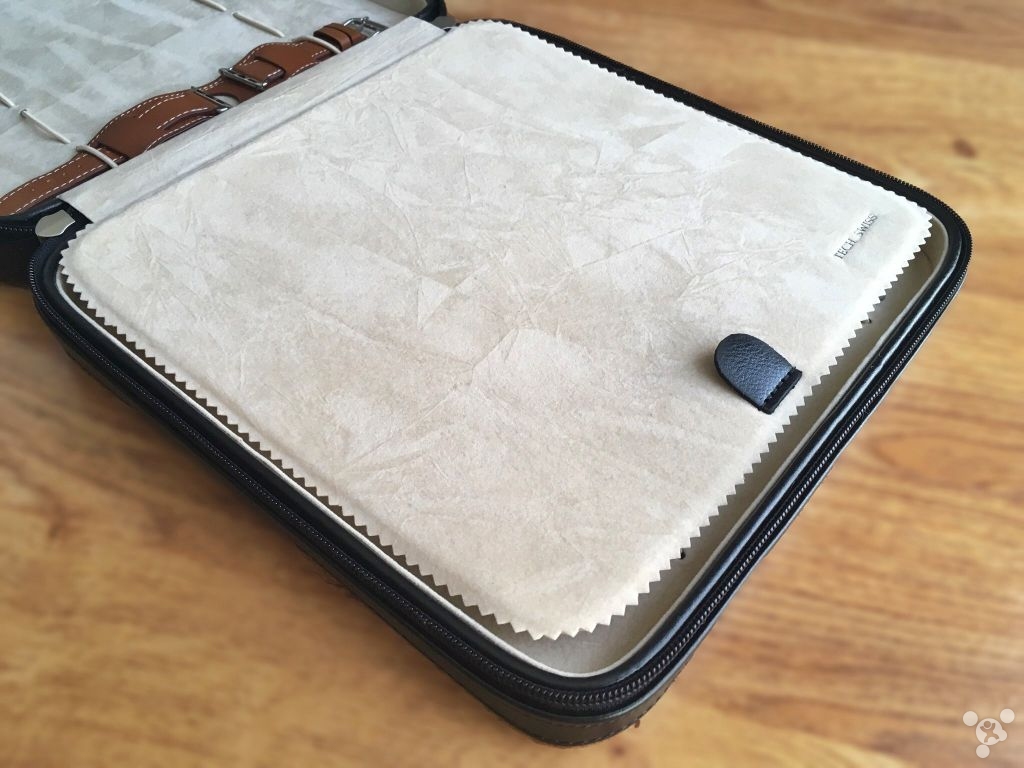 今天要介绍的是一个名为 Tech Swiss Leather Portfolio 的 Apple Watch 表带盒,这个收纳盒最多可以收藏 10 个手表,又或者是 10 款 Apple Watch 表带。盒子表面采用了黑色皮革材质,内部则为柔软的浅褐色棉布,看起来并不会有丝毫的廉价感。打开盒子,每一侧可以放置 5 款表带,当你想关闭盒子的时候,拉起盒子侧边的拉链即可,这样灰尘也不容易“跑进”盒子里。