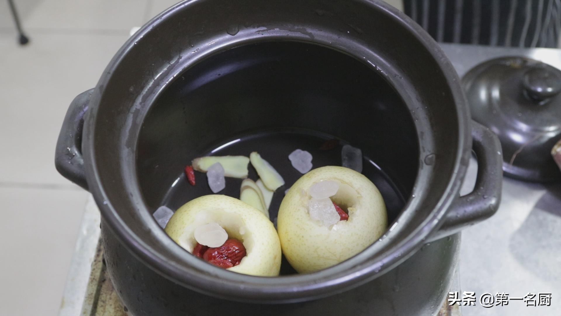 准备一个砂锅,放入雪梨,再把红枣,枸杞子和冰糖放到雪梨的内芯里面,下入姜片,添入适量的清水。