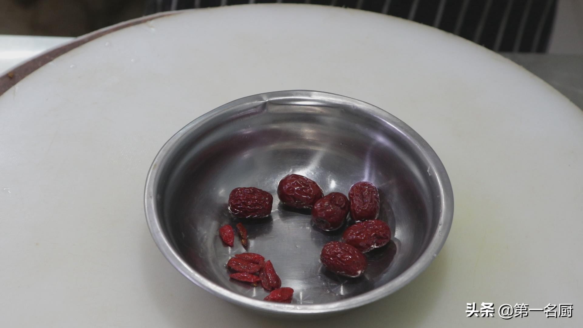 取一个小盆,放入红枣6个,枸杞子一小把。