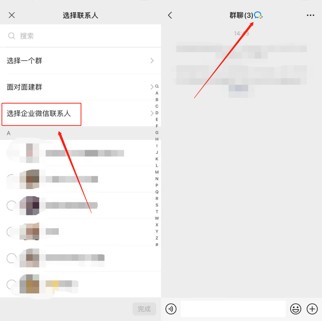 第一种是我们在创建微信群聊时,同时选择了微信客户与企业微信客户加入,那么创建出来的群聊会直接变为企业微信群聊,而不是微信群聊,这时我们可以在群聊页面看到企业微信群聊的标志。
