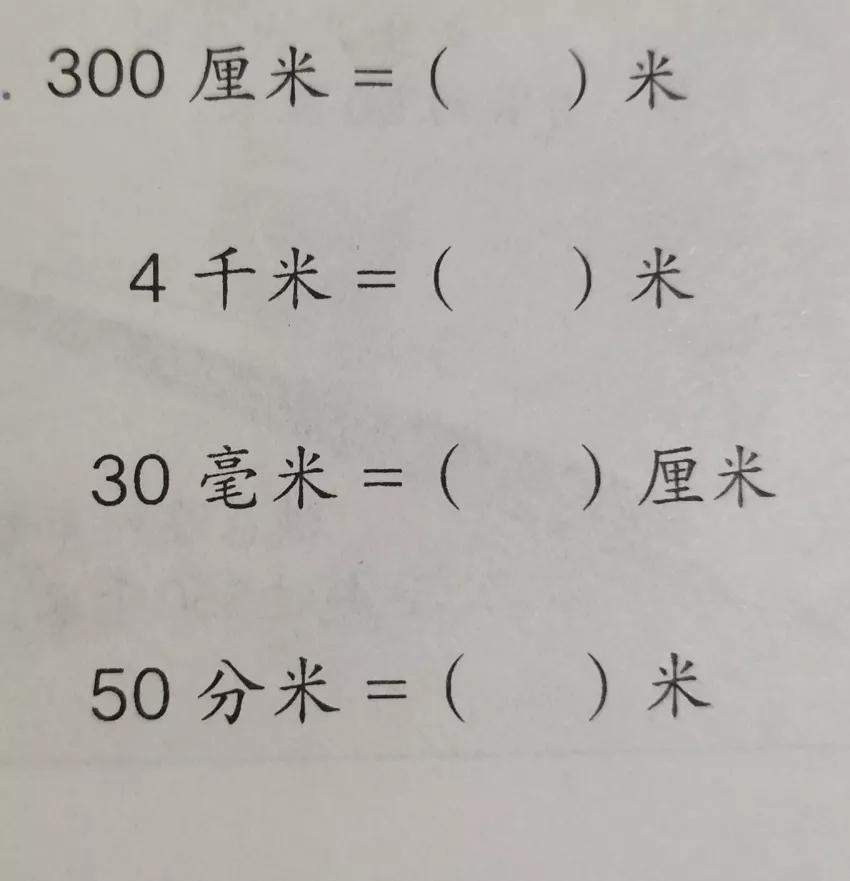 首先第一个就是典型的跨位换算,通常大化小可以让孩子很容易理解,小化大就要考验孩子的逆向思维了。300厘米=?米,千万不要给孩子灌输少几个零这种思维方式,而且也不能让孩子一个劲的去想,一定要在纸上写出来,动手一次,好过动脑十次。加入上期的提问式讲法: