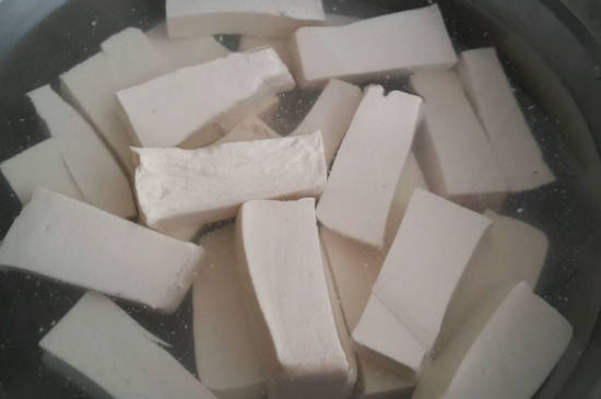 在煎豆腐之前,在容器中倒入适量的温水,在水中加入少量的食盐,搅匀使其溶解。将豆腐切成大小均匀的片状,切好后,将豆腐片放在温盐水中浸泡1~2分钟。盐水可使豆腐脱水,将其泡好后,沥干水分,可将其放在锅中煎炸。