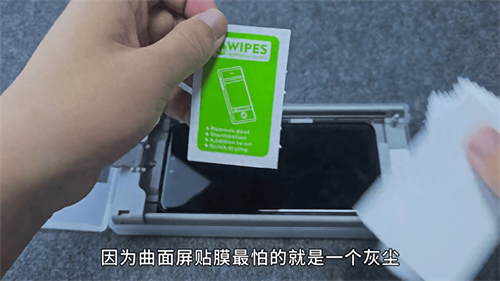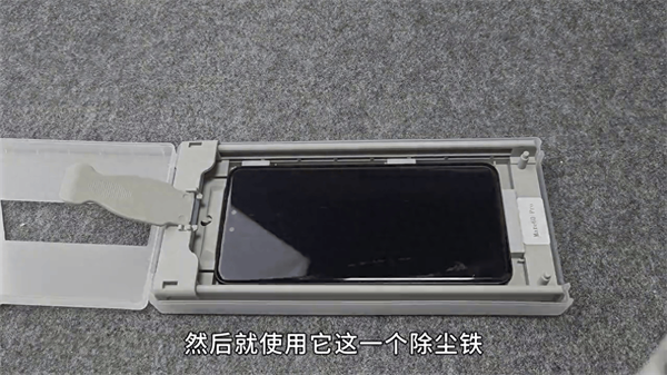 在贴膜前,先将手机放入盒子中固定,并使用清洁工具包清洁屏幕,避免灰尘影响效果。接着使用除尘贴清洁表面灰尘,一定要彻底清理干净。