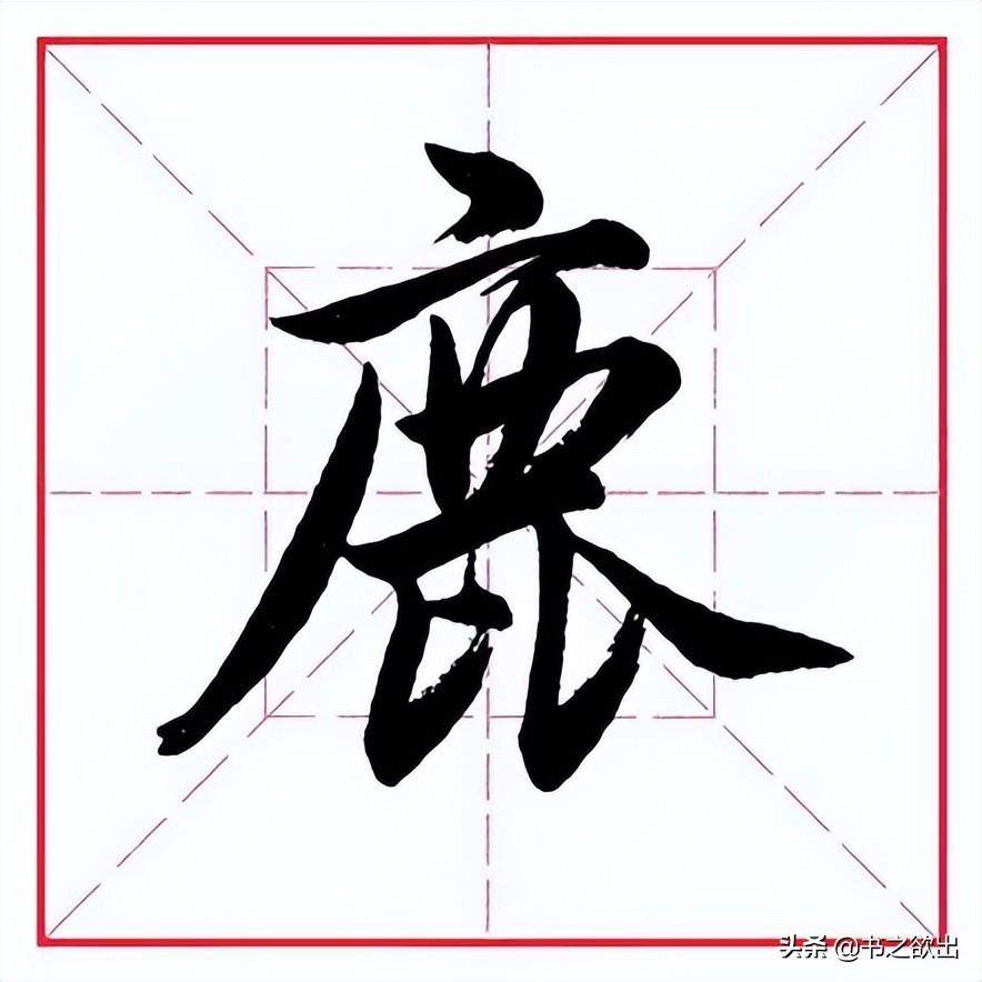 中部紧凑,不要写散。横折横画勿重,抗肩,到位后稍提锋顿笔左斜写右竖,竖身勿长,折笔不要超过首横的收笔;中间两个竖笔左低右高,左轻右重,注意与上面点笔的对应关系;底横起笔左探,抗肩角度稍大,收笔托住右竖。
