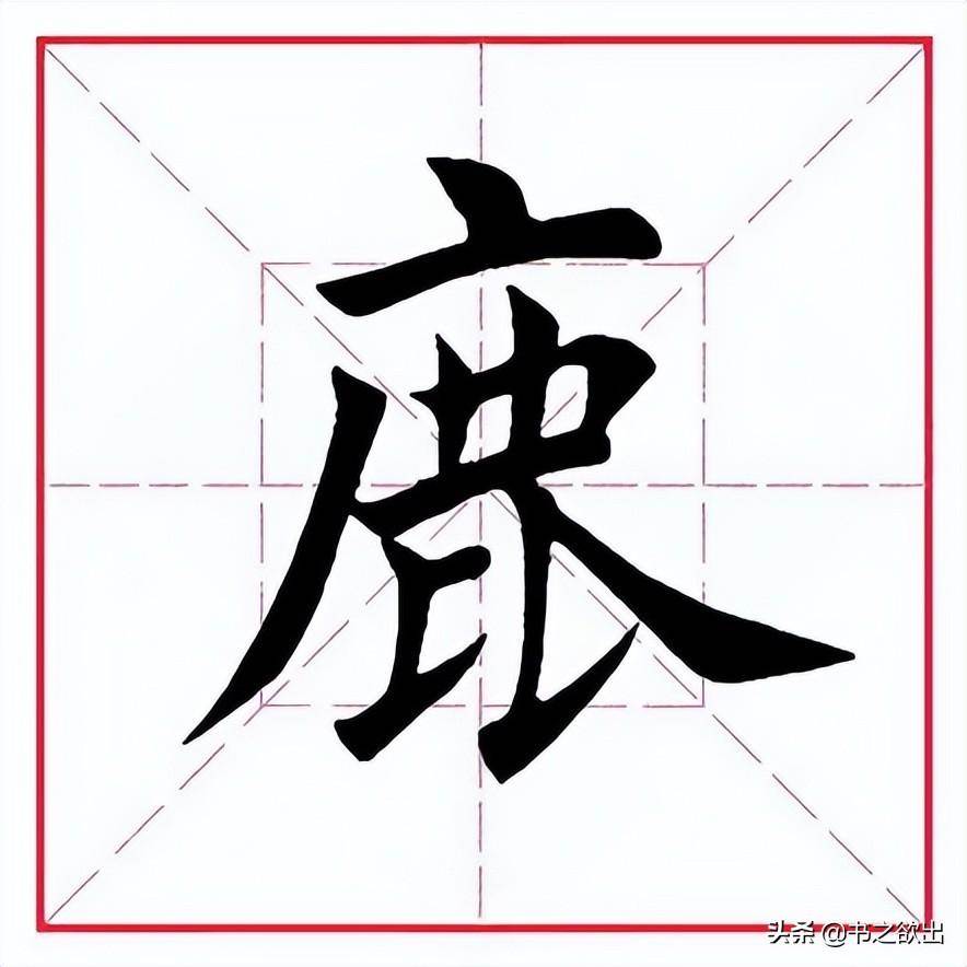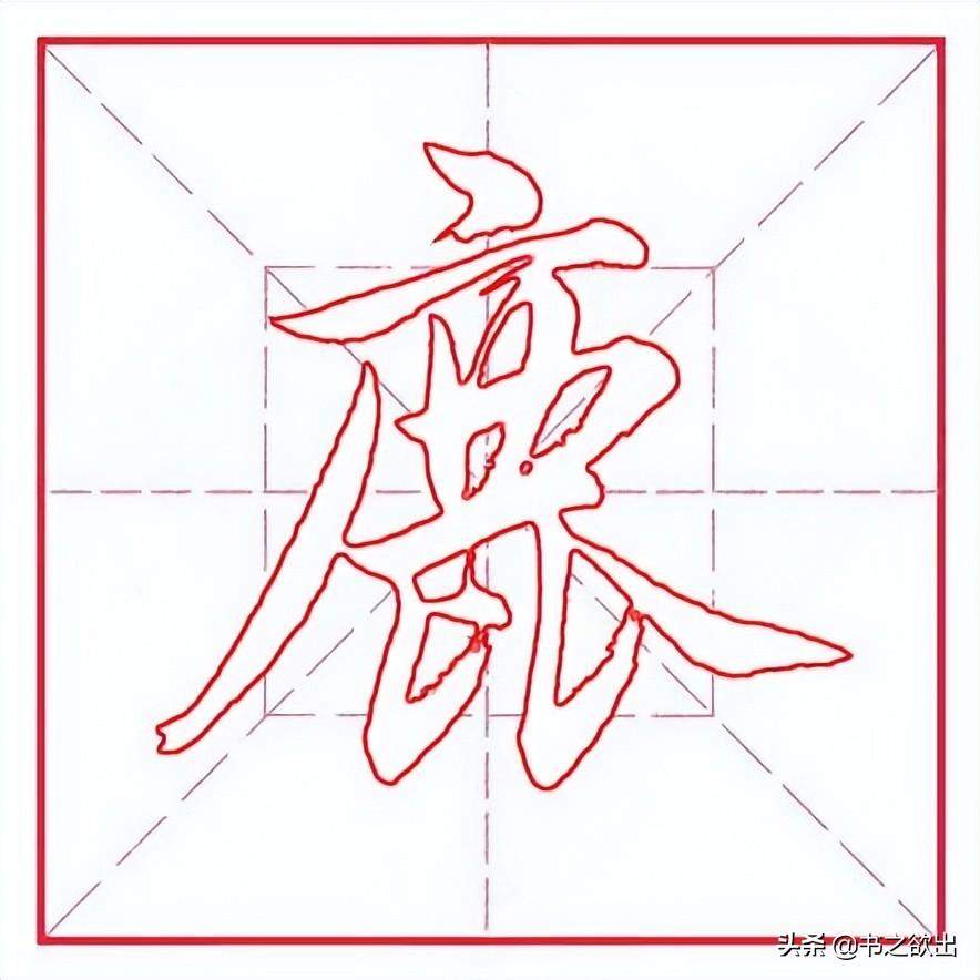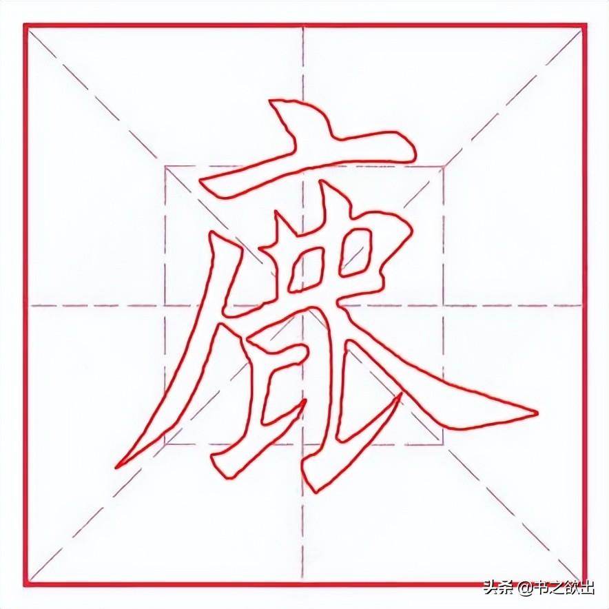 首笔点画居中,以露锋入笔,角度略平,收笔稍向左下引带;横画起笔左探,向右抗肩上行,压点画的收笔处而过,右部略平,略呈仰势;撇画起笔位于横画起笔的下方稍偏右处,撇身稍直,角度稍立,注意行笔的轻重变化,过撇肚后稍带弯度向左快速提锋撇出,力达撇尖。