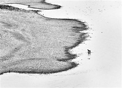 莱茵河水位下降,一只小狗在莱茵河畔玩耍 摄影/新华