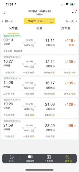 截至11点37分,购票网站上,明天最早一班9点19分从泸州站出发成都东站的列车已经没有余票,但当天10点27分,14点26分,19点26分,21点59分,均有余票可以购买。