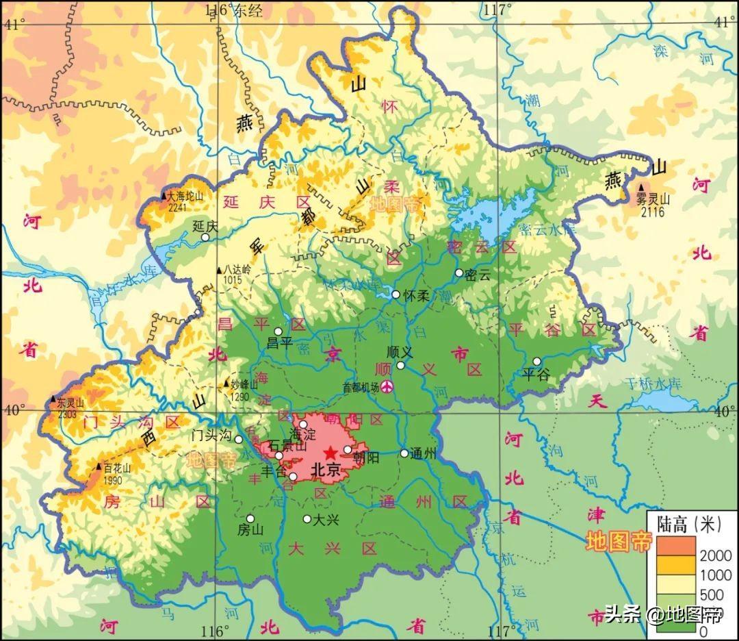 北京是我国首都,左环沧海,右拥太行,北枕居庸,南襟河济。北京位于华北平原西北端,西邻太行山脉,北靠燕山山脉,最高峰是西部太行山脉余脉西山的东灵山,海拔约2303米。