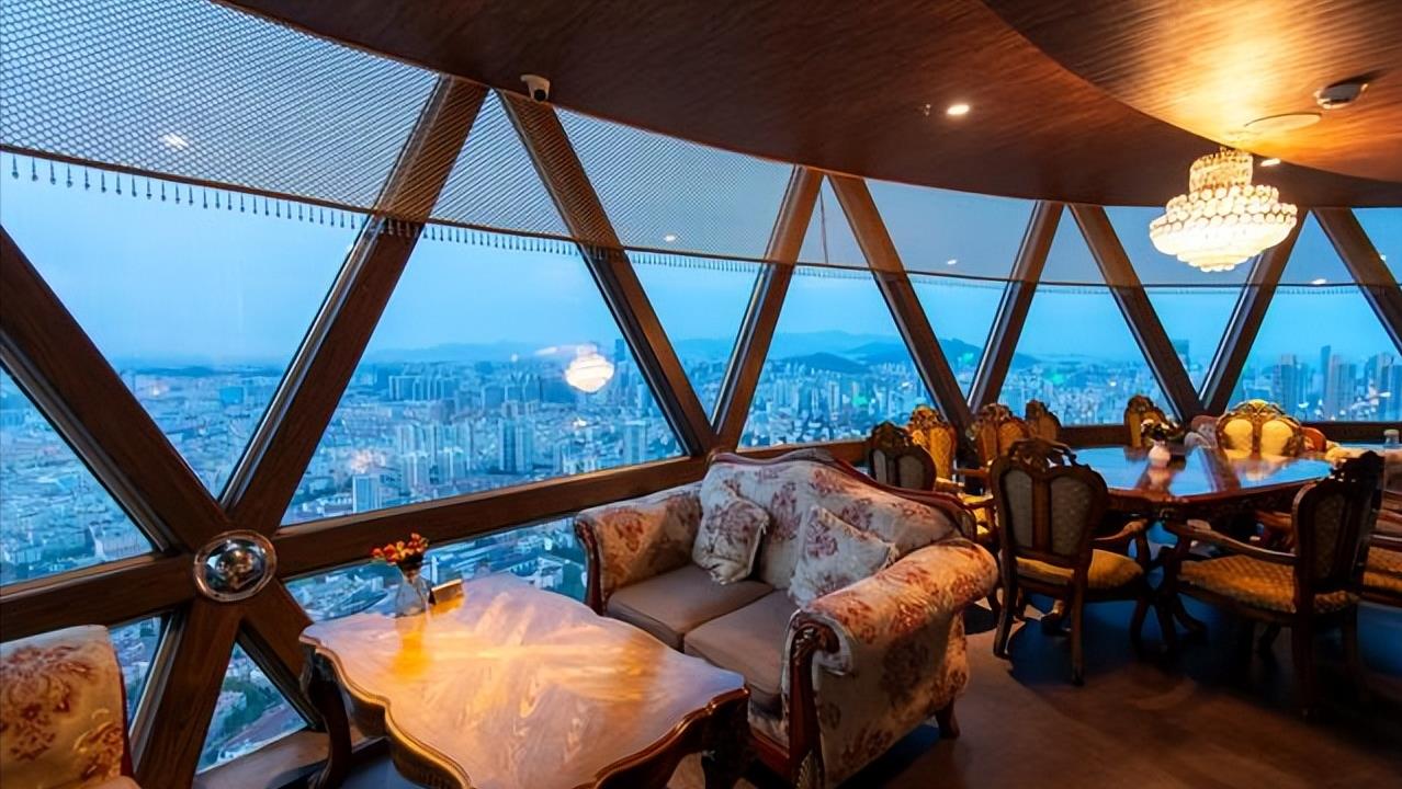 我曾跟朋友在这里就餐,中午一餐下来,正好是一圈,选一个靠窗子的位置,很多城市都有旋转餐厅,但是它是亚洲最高的一个,高达267米;