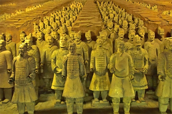 秦兵马俑仿真人真马制成现如今保留着8000多个,一眼望去栩栩如生,场面宏大,威风凛凛。