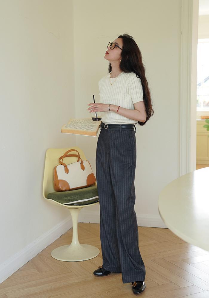 举个例子,短款的小上衣,可以让上半身的比例缩短,让身材比例看上去更加完美;另外在下半身搭配高腰款式的阔腿裤,除了可以兼顾到显高挑和显腿长的效果之外,对于胯部、大腿和屁股的包容性也会非常好。
