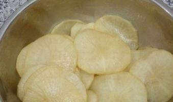 第二步,将白萝卜清洗干净之后,直接将白萝卜切成薄片状或者条状也是可以的,切好之后,放在一个干净的大碗里面装好。