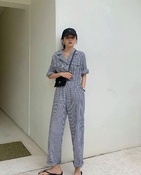 这款是长袖长裤的设计,在夏天看到的会比较少一点,但是!它真的超级舒服,怎么穿都不嫌多。黑白格纹的设计很有英伦风的感觉,工装的版型也给衣服增加了休闲的气息,看上去更加舒服自然,有点随性又有点设计。面料是类似于雪纺的那种非常轻薄自然,穿在身上完全没有负重感,小仙女们轻松驾驭哦。