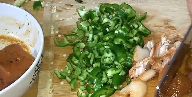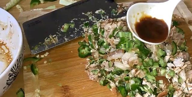9)把焖好的卤肉取出,青椒去蒂去籽,切成米。卤肉切成末和青椒混在一起搅拌均匀。