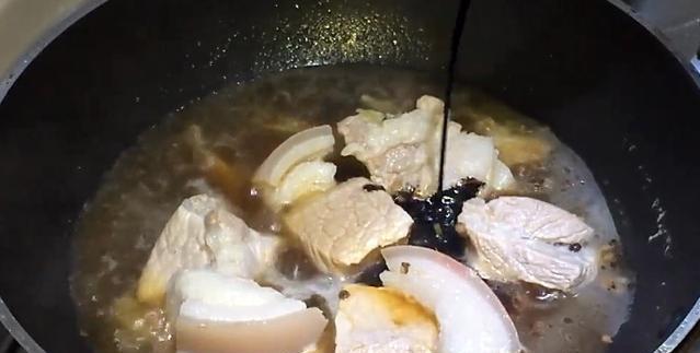 5)30分钟后加适量的生抽和老抽,再多封一点盐,把肉翻一下面,继续煮30分钟。