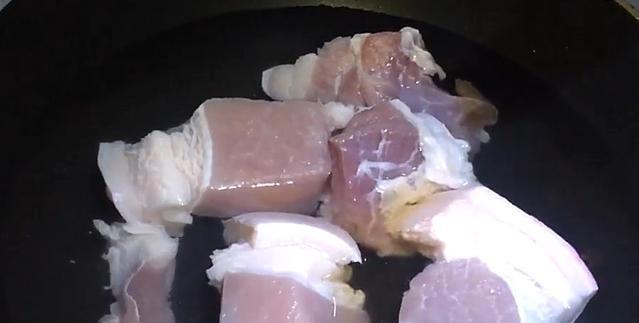 3)卤肉切成大块放在锅中,加入冷水没过卤肉,加一点料酒,大火烧开。