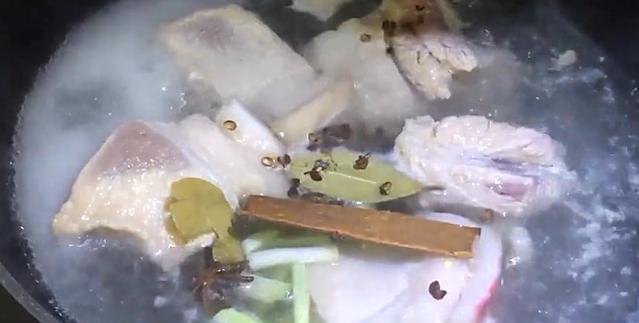 4)烧开后撇去锅中的浮沫,放入葱段、姜片、香叶、桂皮和花椒盖上盖子中火煮30分钟。