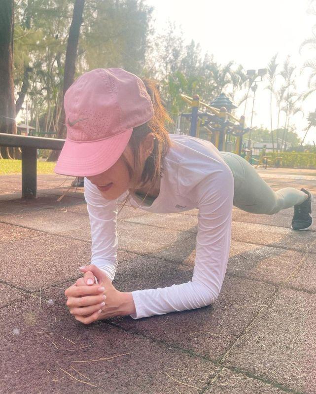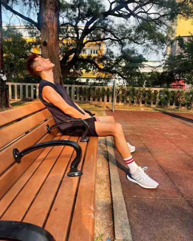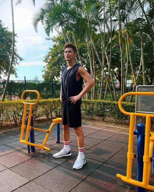 结果陈家乐当然就出去做运动啦,身穿黑色运动服的他在大热天跑步和健身,其实他看起来身材还是可以的。