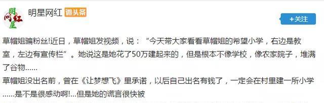 如今,草帽姐因自己的种种言行,渐渐的不再受到关注。近日,草帽姐在XX平台上发视频说,自己花了50万元建起了一座希望小学。视频发出后,当地人极为愤怒。因为在视频中,花50万建起来的小学根本不像学校,反而像农家院子,地面上甚至还堆满了谷物。据知情人透露,这个院子确实是草帽姐出资建造的,但是却是给她弟妹开幼儿园用的,去年幼儿园检查手续不合格被关停了,现在一直荒废着。