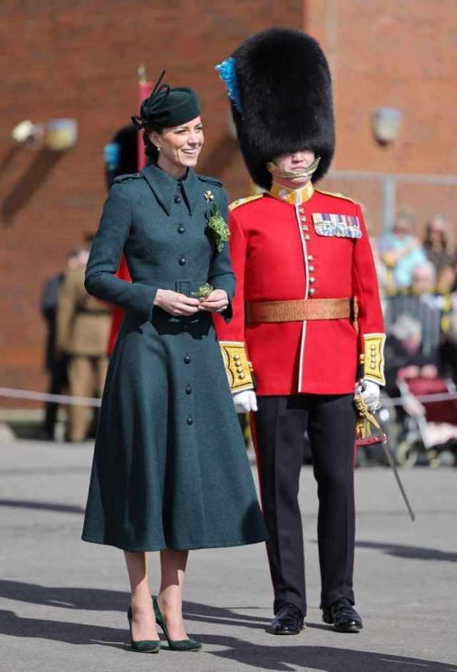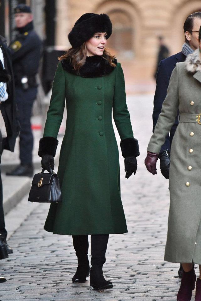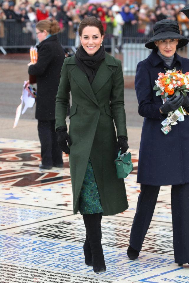 要想大衣有冬天氛围,像凯特王妃一样选择衣领、部位拼接短毛绒的军绿色大衣最安心。