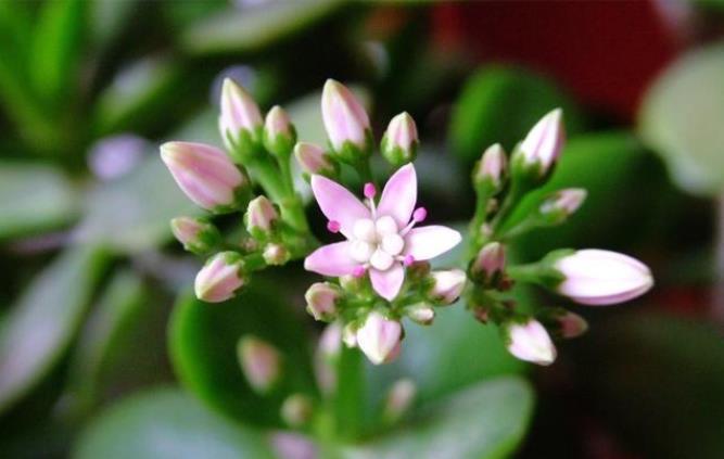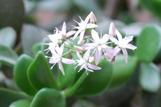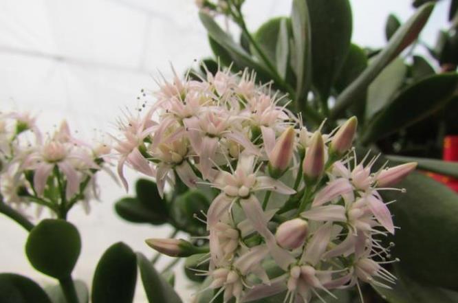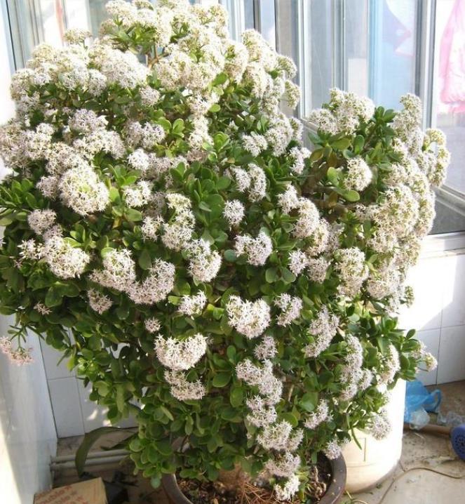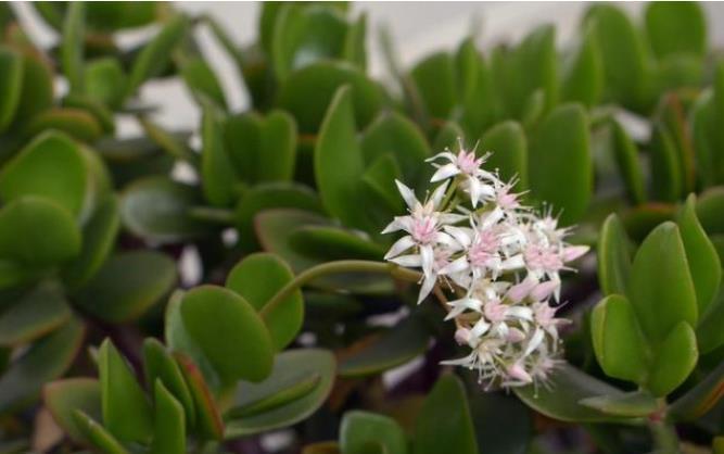 玉树喜欢干燥的生长环境,冬天养护时空气湿度应低于50%,更有利于开花。要是空气湿度过高,玉树营养生长旺盛,叶子浓绿油亮,又宽又肥厚,是很难开花的。正因为玉树在干燥环境中容易开花,所以北方养护的玉树就容易开花一些,南方养护的玉树开花难度就会大一些。玉树喜欢干燥,所以平时养护别叶面喷水。喷水一方面可能会导致枝叶腐烂,另外一方面会长气生根,影响整体的观赏。