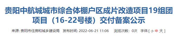 乐居新媒体贵阳讯 6月21日,从贵阳市住房和城乡建设局获悉,贵阳中航城城市综合体棚户区成片改造项目19组团项目(16-22号楼)(推广名:万科新都荟)交付备案公示发布。
