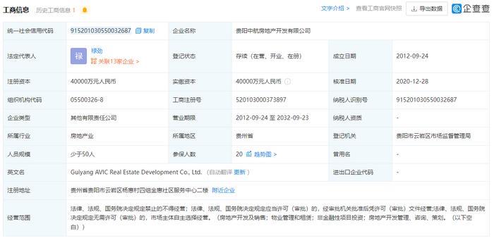 据企查查公开信息显示,贵阳中航房地产开发有限公司2012-09-24,法定代表人为禄劲,注册资本为40000万元人民币,统一社会信用代码为915201030550032687,企业地址位于贵州省贵阳市云岩区杨惠村四组金惠社区服务中心二楼,所属行业为房地产业,经营范围包含:法律、法规、国务院决定规定禁止的不得经营;法律、法规、国务院决定规定应当许可(审批)的,经审批机关批准后凭许可(审批)文件经营;法律、法规、国务院决定规定无需许可(审批)的,市场主体自主选择经营。(房地产开发及销售;物业管理和租赁;非金融性项目投资;房地产开发管理、咨询、策划。(以下空白))。