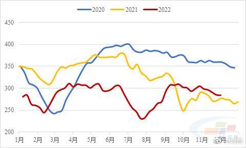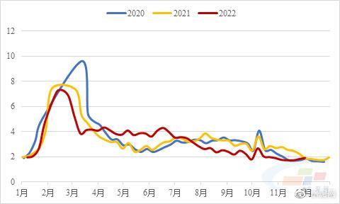 11月份,国内普遍出现降温天气,施工条件环比明显走弱,北方基本进入传统淡季,下游采购刚需不足。南方地区虽然存在一定的赶工需求,但在防疫管控趋严的背景下,螺纹钢需求难以得到释放,成交量仍维持在偏低水平。贸易方面,“弱现实”情况未得到改善,市场心态仍保持谨慎观望为主,贸易端成交量延续下行趋势。从数据来看,11月螺纹钢周均表观需求量在307.53万吨左右,环比减少0.13%,同比增幅为0.46%。贸易方面,11月建材日均成交量在15.62万吨左右,环比减少0.48%,与去年同期相比减少13.04%。