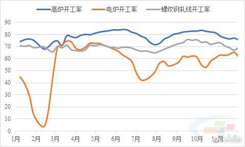 图2:高炉、电炉以及螺纹钢轧线开工率(%)