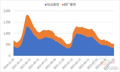 11月份,螺纹钢供需双降,库存环比仍有所减少,但月内降幅日渐收窄,至月底开始出现累库迹象。至11月底,国内螺纹钢总库存降至532.27万吨,环比减少14.09%,与去年同期相比减少24.79%。其中,钢铁企业螺纹钢库存降至178.90万吨,环比减少10.78%,同比降幅为32.48%;螺纹钢社会库存降至353.37万吨,环比减少15.68%,同比降幅为20.19%;