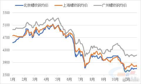 截至11月底,北京、上海和广州螺纹钢市场现货均价分别为3700元/吨、3770元/吨和4130元/吨。从区域间价差来看,北京-上海市场螺纹钢价差由-90元/吨收窄至-70元/吨;上海-广州市场螺纹钢价差由-440元/吨收窄至-360元/吨。