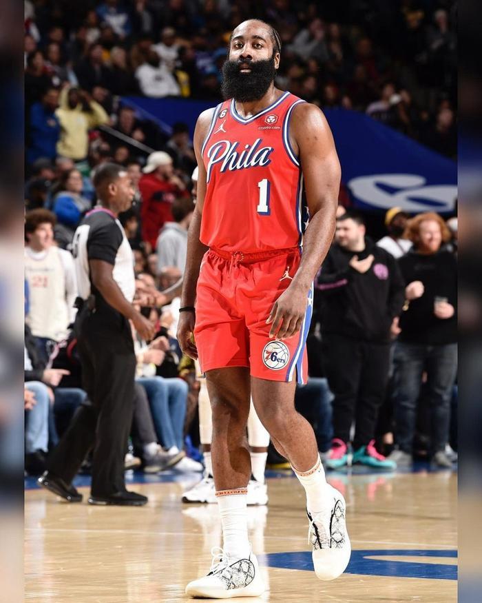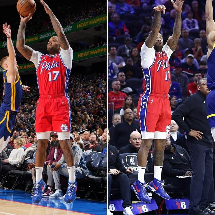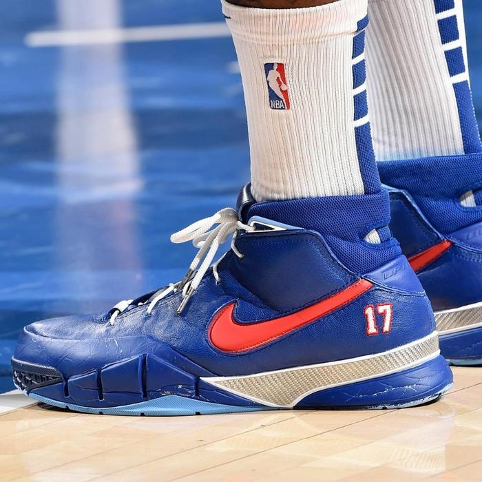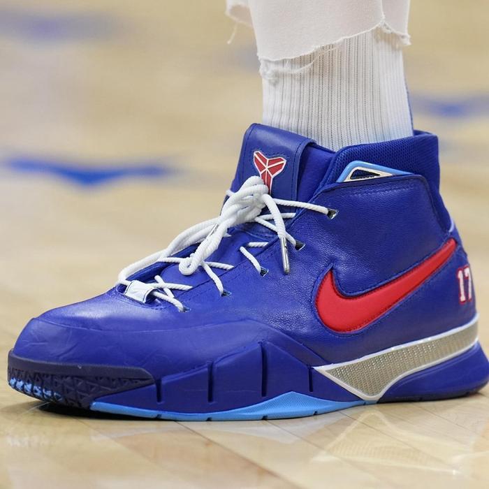 整体配色上就是76人经典的蓝红装扮,后跟处点缀塔克的17号刺绣,不少网友猜测这是Nike为他打造的PE。