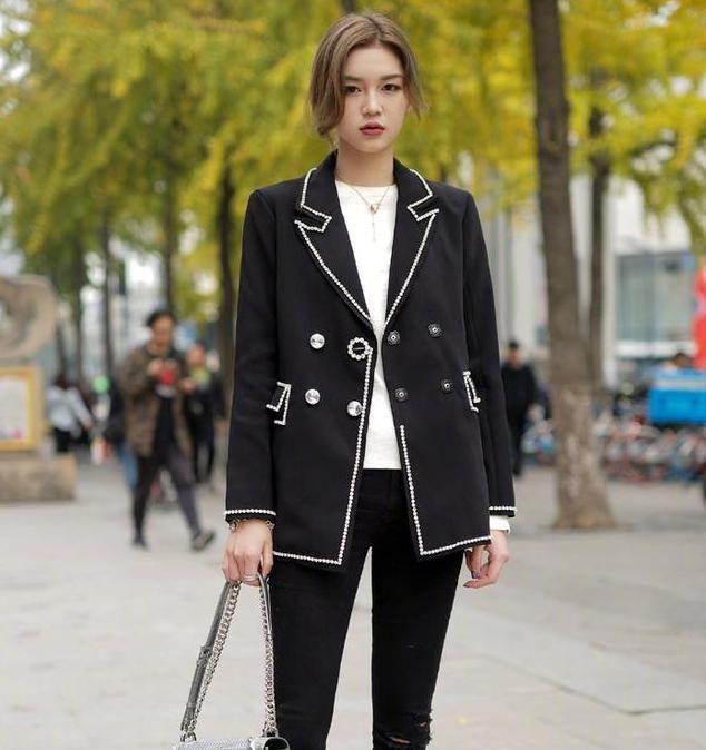 这位身材高挑的小姐姐,一件低调奢华的小西装外套搭配黑色紧身破洞裤,穿出独我的强大气场。
