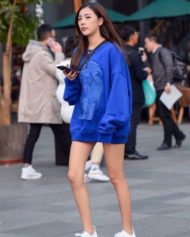 蓝色休闲上衣,露出大长腿,白色鞋子是亮点!【街拍:物以类聚人以群分,美女身边一定是美女,图4美女跟我回家】