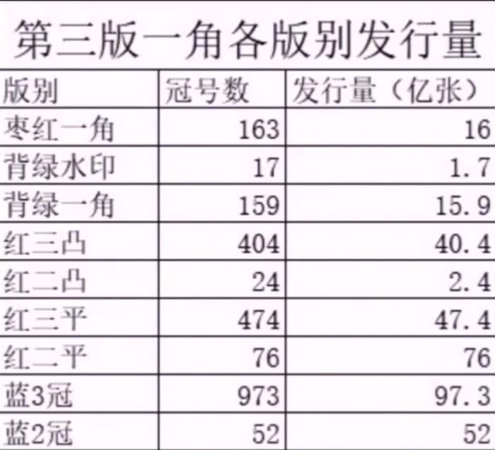 下面再给大家看一下这9个版本的发行量,大家看就是这张图片从发行量中我们可以看到,背绿水印它的发行量是最少的只有1.7亿枚,但是值得关注的是红二凸它的发行量也不大,只有2.4亿张,目前的价格也不算太高,所以它收藏潜力还是比较大的,所以喜欢的朋友可以趁它还在低位的时候入手一些,未来它的升值空间相对于其它的1角纸币还是比较大的。