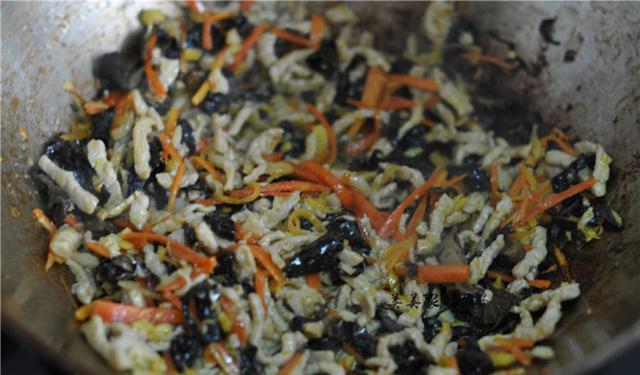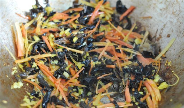 下胡萝卜和木耳丝炒至断生,在蔬菜里下约1g盐,翻炒均匀。