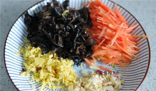 猪腿肉180g 泡椒 8g 姜蒜各10g 葱少许 水发木耳和胡萝卜少许(胡萝卜可用笋丝或者莴笋代替)。猪腿肉 木耳和胡萝卜切丝,泡椒和姜蒜切末