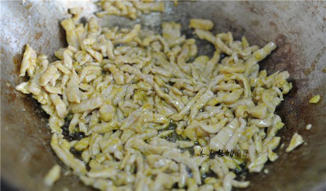 热锅凉油下入腌制好的肉丝,炒到断生,烹入少许料酒去腥增香,捞出备用。