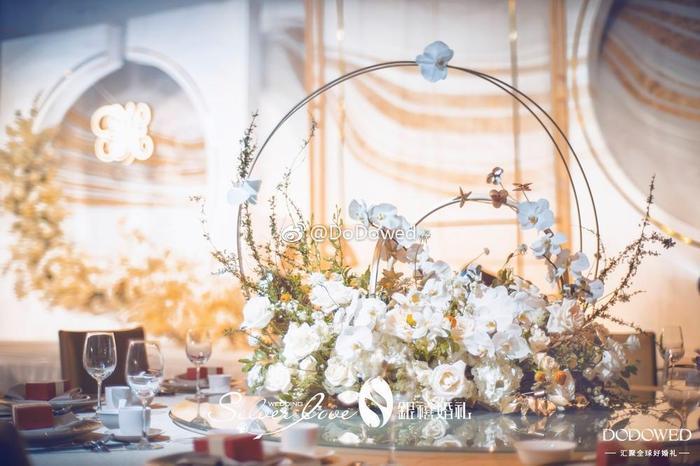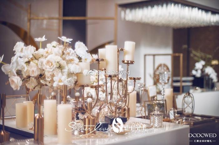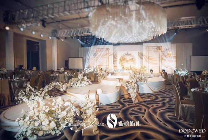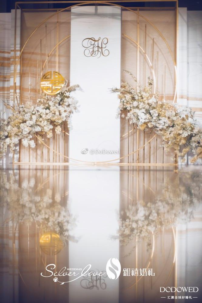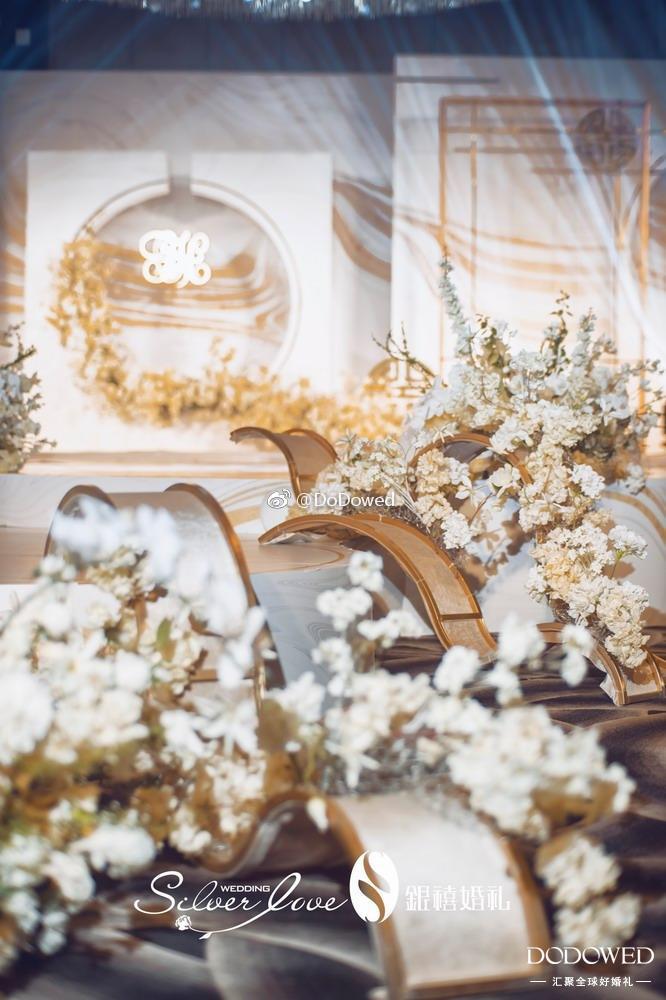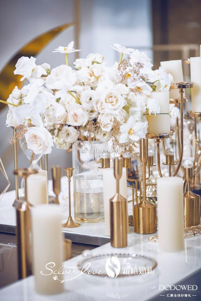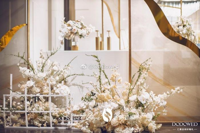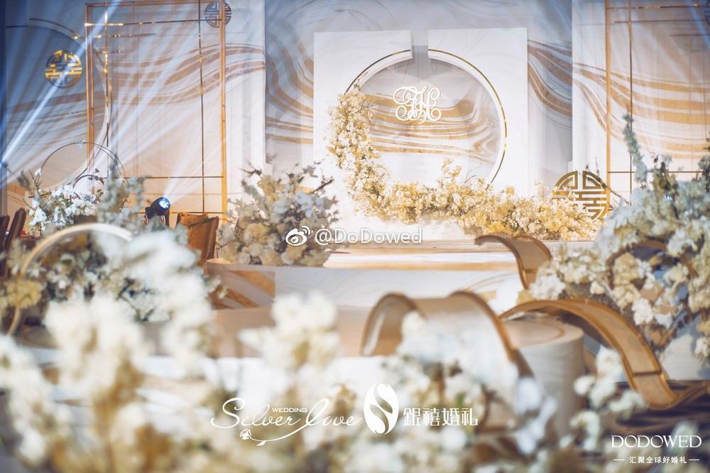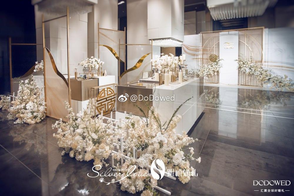 DODO观点:白金色的搭配真是博尽眼球,正式而且硬朗的线条,让整个婚礼有了很大的张力,看起来非常的强势加耀眼,而细微处的镜面材质,就像不经意发现的小美好,让婚礼更加大放光彩 婚礼策划:@广州银禧婚礼策划